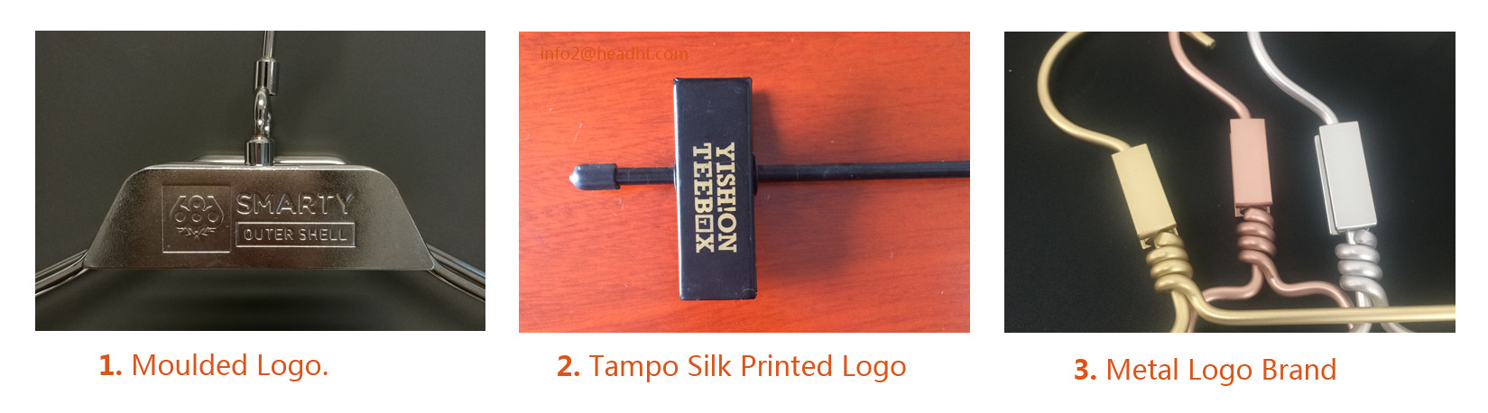 Metal Hangers have great load bearing aiblity. So normally used for mens' clothes and Heavy cltohes. Also can do custom order on logo and hook part as below: