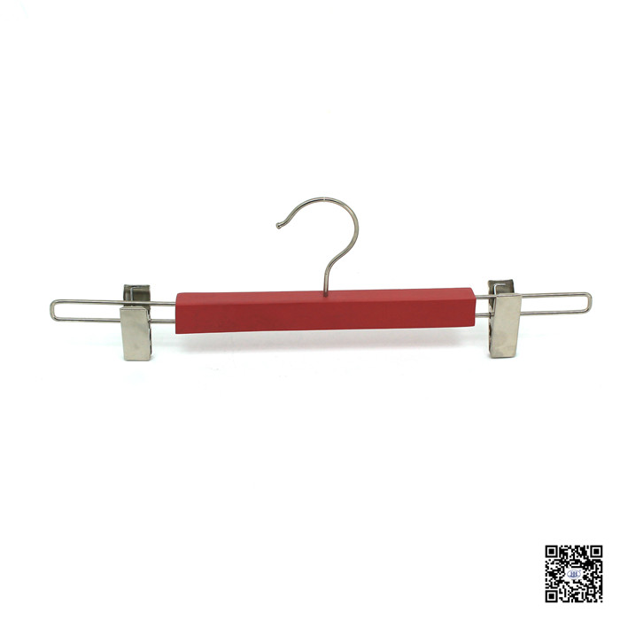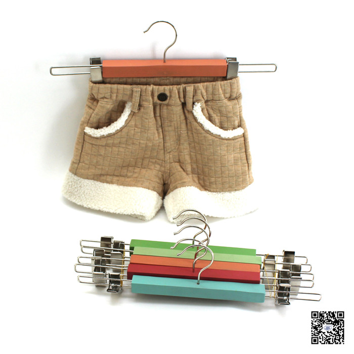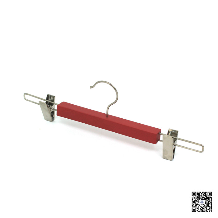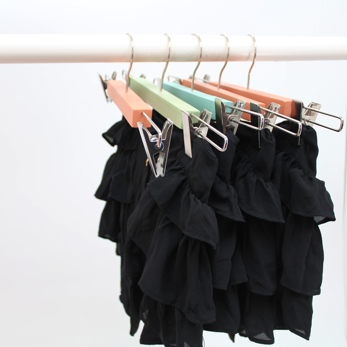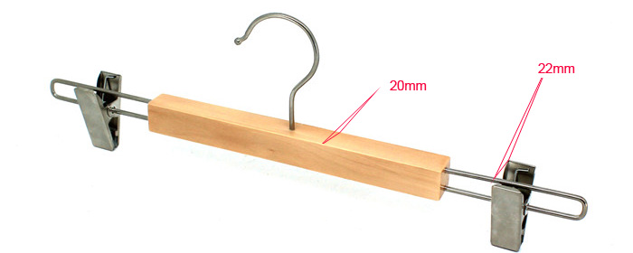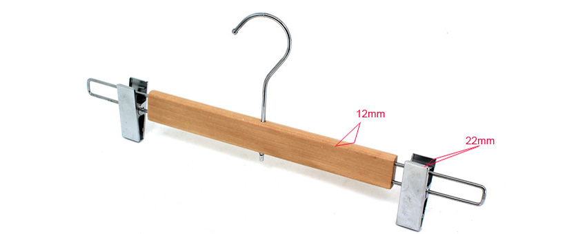 We use Square Wood to add metal clips which thickness is 1.8-2cm which is almost same than the clips open width. That means when hanging the clothes on the rack. the clips wont touch each other and clothes has enough space to each other. And on the same time don't need extra space.