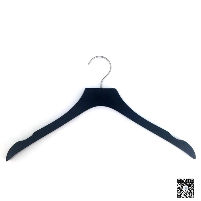 Warp body shape standard clothes hanger. with Large U notches. Swivel hook, black Matte Paint finishing. Rubber soft finishing is workable.