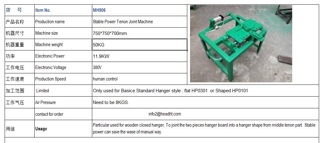 Particular used for wooden closed hanger, To joint the two pieces hanger board into a hanger shape from middle tenon part. Stable power can save the wase of manual way. All the information done by HEAD INT'L. should not OK to be used as commercial way without agree.
