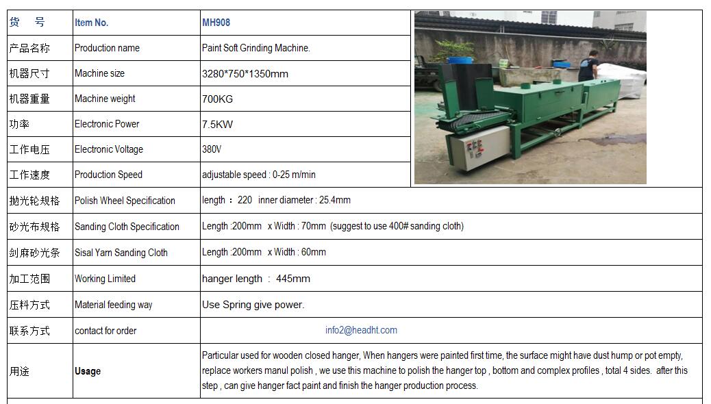 MH908 | Particular used for wooden closed hanger, When hangers were painted first time, the surface might have dust hump or pot empty, replace workers manul polish , we use this machine to polish the hanger top , bottom and complex profiles , total 4 sides. after this step , can give hanger fact paint and finish the hanger production process. | |||