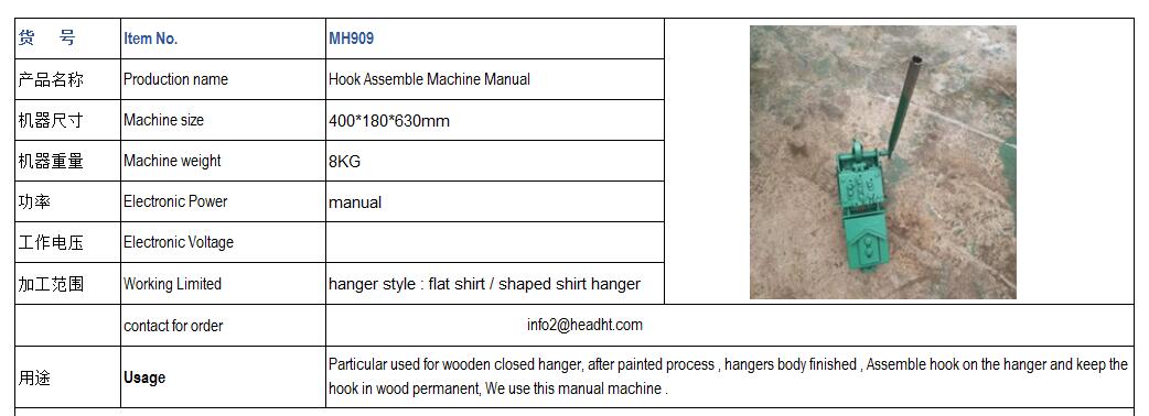 MH909 | HOOK ASSEMBLE | Particular used for wooden closed hanger, after painted process , hangers body finished , Assemble hook on the hanger and keep the hook in wood permanent, We use this manual machine . | ||