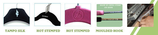 Velvet Hanger normally use plastic hanger as bottom ground basic. Because it need very smooth surface. So we have one way to add logo on the hanger as below. If order quantity big. can add logo on hook also, Mould cost needed.
